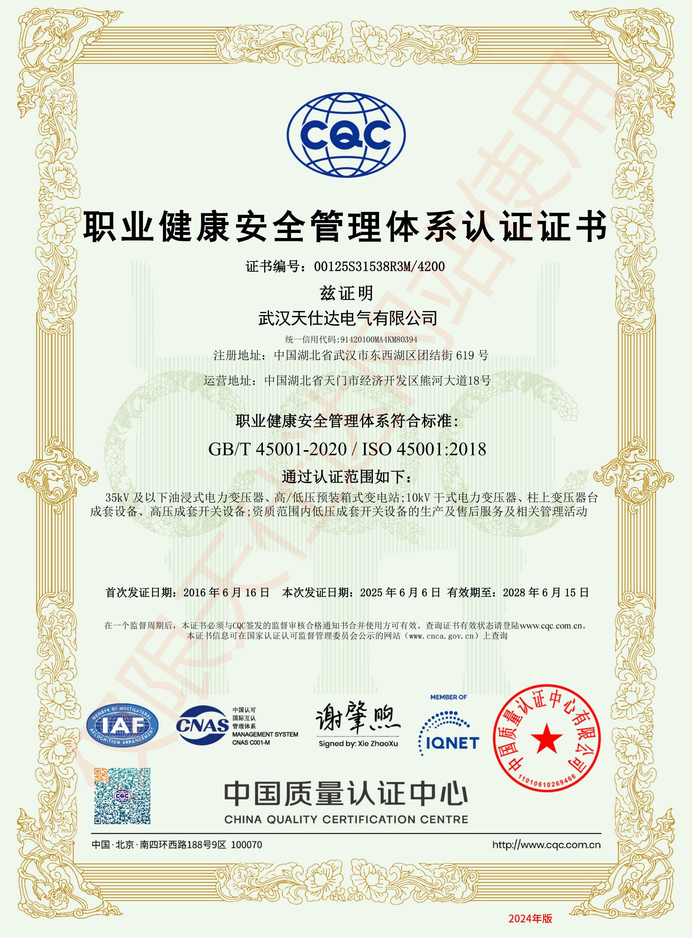 公司通過了ISO9001質量管理體系、ISO14001環(huán)境管理體系、ISO45001職業(yè)健康安全管理體系認證、低壓產(chǎn)品認證證書以及湖北省“專精特新”小巨人企業(yè)認定;擁有電力設施承裝(修、試)、電力工程施工總承包、輸變電工程專業(yè)承包、建筑機電安裝工程專業(yè)承包、城市及道路照明工程專業(yè)承包、電子與智能化工程專業(yè)承包等專業(yè)資質。作為國家電網(wǎng)與南方電網(wǎng)合格供應商,公司榮獲湖北省變壓器行業(yè)協(xié)會副會長單位、企業(yè)質量信用AAA級、武漢市“守合同重信用”企業(yè)等榮譽稱號。