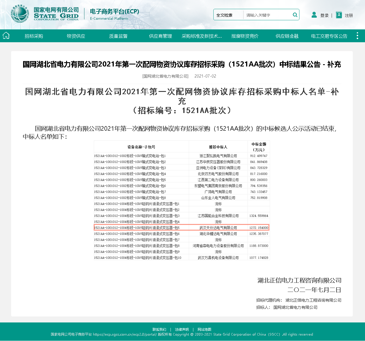武漢天仕達電氣憑借在電力行業(yè)多年的積累、出色的業(yè)績、專業(yè)的技術能力以及在國家電網(wǎng)良好的口碑,在此次“國網(wǎng)湖北省電力有限公司2021年第一次配網(wǎng)物資協(xié)議庫存招標采購項目”中,順利中標包5-10kV硅鋼片油浸式變壓器,中標金額約1272萬元,設備臺數(shù)共計485臺。